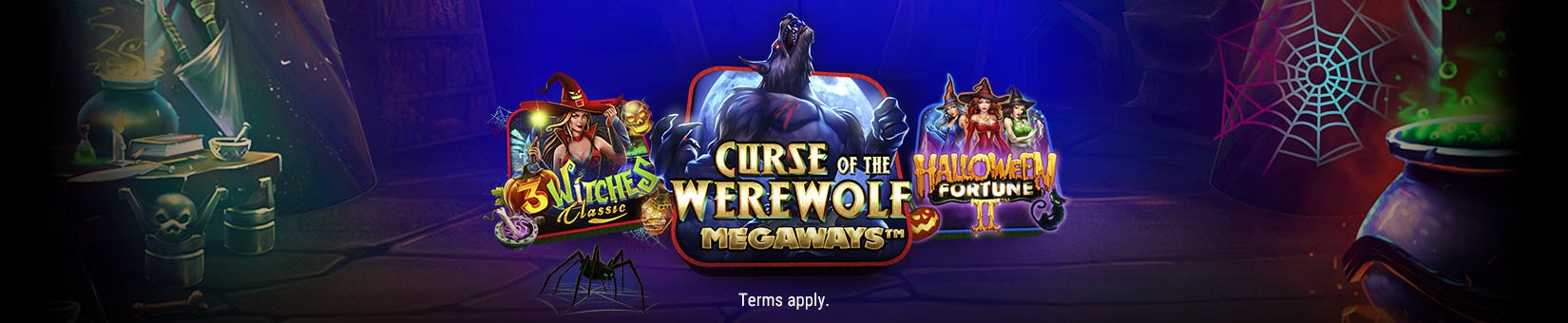 Curse of Were Wolf Megaways, Vampires Vs Wolves, Trick o Treat, 3 Witches Classic, Grim Muerto, House of Doom, Lucky Halloween, Halloween Fortune II, Dracula, Voo doo Temple, The Goonies Hey you Guys, Ghostbusters Plus.